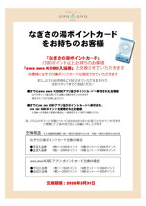 「なぎさの湯ポイントカード」1500ポイント以上お持ちのお客様、「awa awa KOBE入浴券」と交換させていただきます。