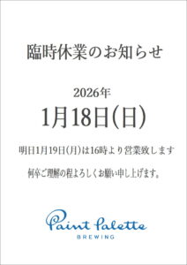 【1月18日(日)】Paint Palette Brewing臨時休業のお知らせ
