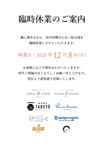 誠に勝手ながら、社内研修のため下記日程を 臨時休業とさせていただきます。