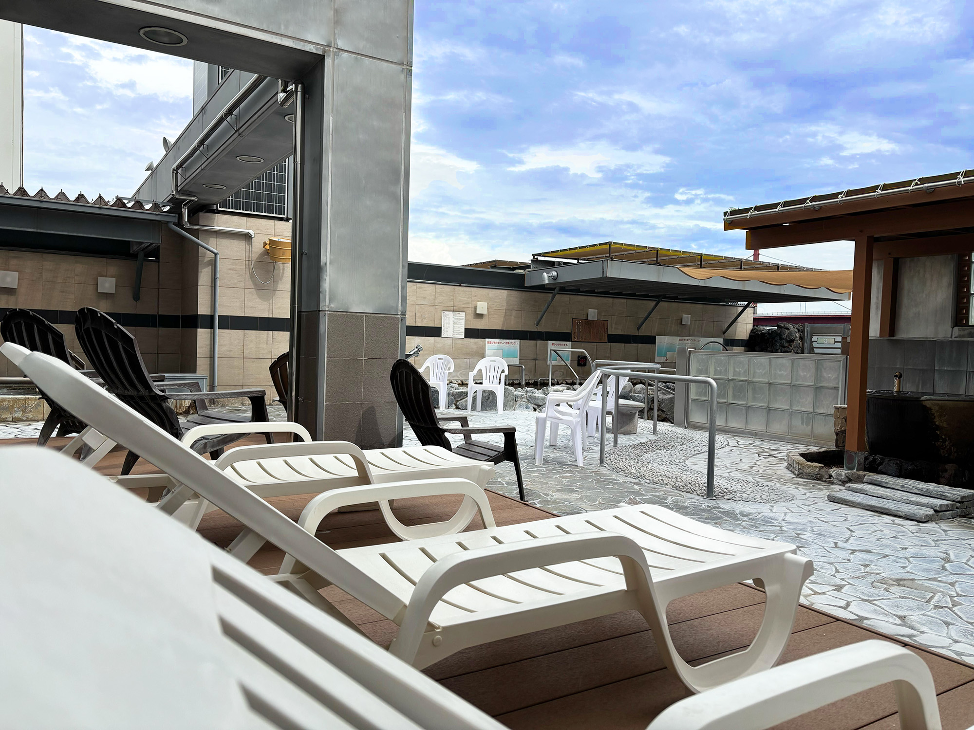 露天風呂エリアには寝転んで空を眺められるスペースを広げました。